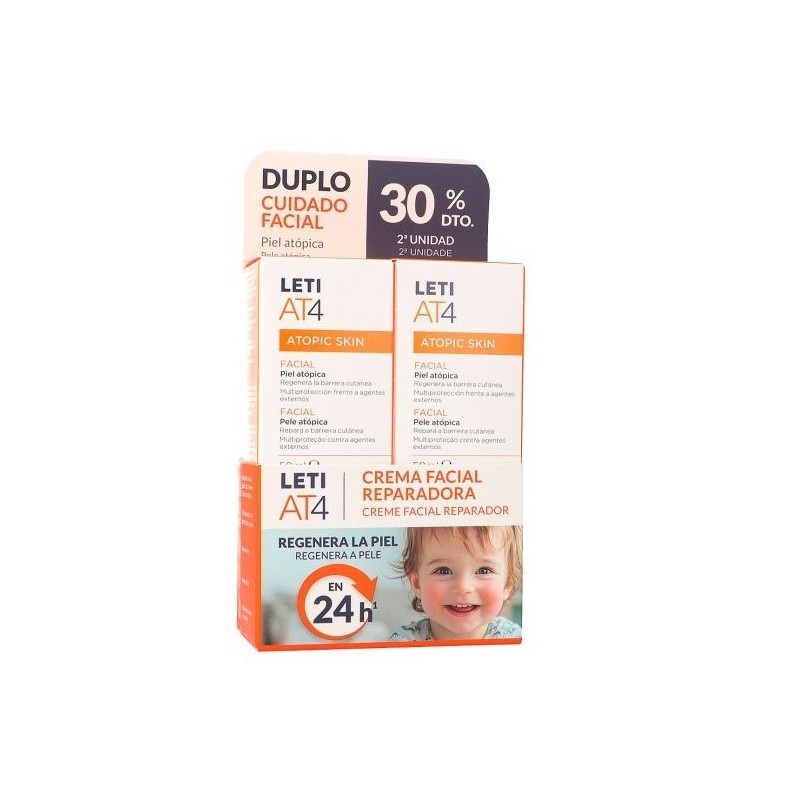Duplo leti at4 atopic skin facial de leti pharma es un tratamiento específico para el cuidado diario de la piel atópica, muy seca y sensible del rostroSu fórmula emoliente y protectora contribuye a restaurar la función barrera de la piel, aliviar la sensación de picor y disminuir la irritación y la sequedad facial, proporcionando confort inmediato y duraderoEstá especialmente indicada para personas con tendencia atópica que necesitan una hidratación intensa y una protección frente a agresiones externas como el frío, el viento o la contaminaciónSu textura ligera facilita la absorción sin dejar sensación grasa, siendo adecuada para uso frecuenteBeneficios principales: hidrata intensamente y de forma prolongadaAyuda a reparar y fortalecer la barrera cutáneaCalma el picor y la irritación de la piel atópicaTextura ligera de rápida absorciónFormato duplo 2x50 ml, ideal para uso continuado o ahorro.