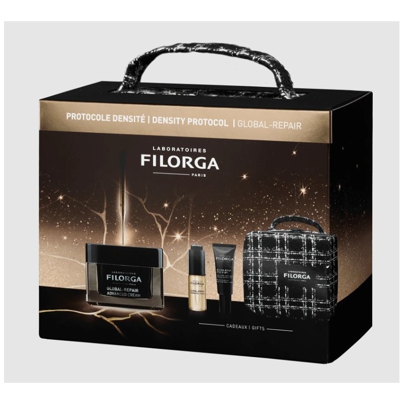 Filorga global repair advanced crema 50 ml es un tratamiento antiedad intensivo inspirado en la medicina estética, diseñado para pieles desvitalizadas o con signos visibles de la edad. Su fórmula ultra-nutritiva ayuda a regenerar la piel, mejorar la firmeza, suavizar arrugas y devolver confort y luminosidad al rostro. Este pack especial incluye de regalo un neceser y dos minitallas: global repair advanced elixir, que potencia la acción regeneradora y revitalizante del tratamiento. Global repair eyes & lips, específico para cuidar y rejuvenecer el contorno de ojos y labios. Una rutina completa para una piel visiblemente más joven, nutrida y revitalizada. Ideal para regalar o para disfrutar de un cuidado premium en casa